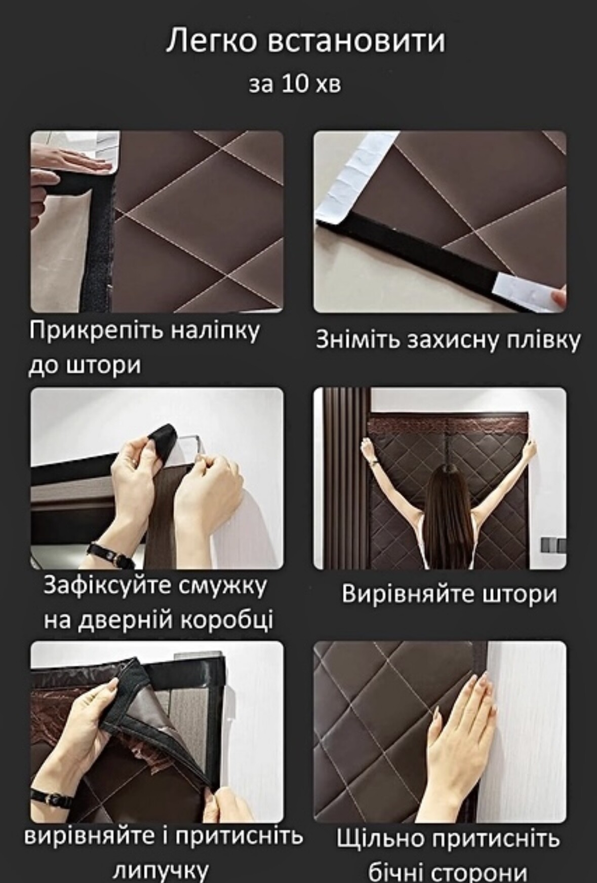 Штора кріпиться без свердління — монтаж займає всього кілька хвилин. По всій довжині вшиті потужні магнітні вставки, які дозволяють шторі автоматично та безшумно закриватися після проходу. Це особливо зручно, якщо у вас зайняті руки або в домі є діти.